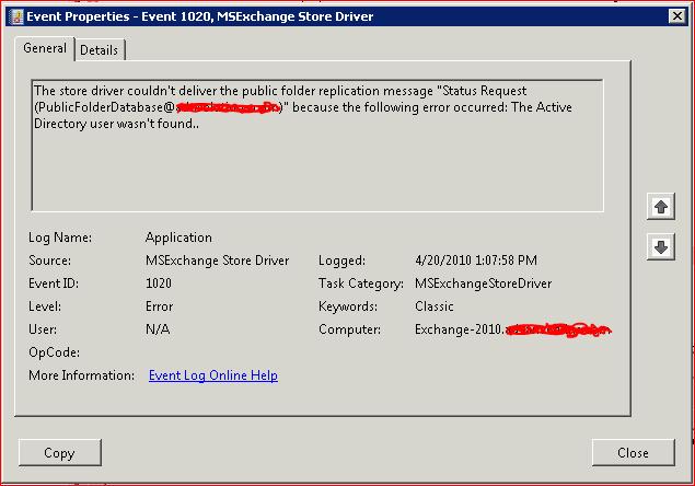 Event ID: 1020, Source: MSExchange Store Driver. The store driver couldn’t deliver the public folder replication message “Status Request (PublicFolderDatabase@yourdomain.com)” because the following error occurred: The Active Directory user wasn’t found.
